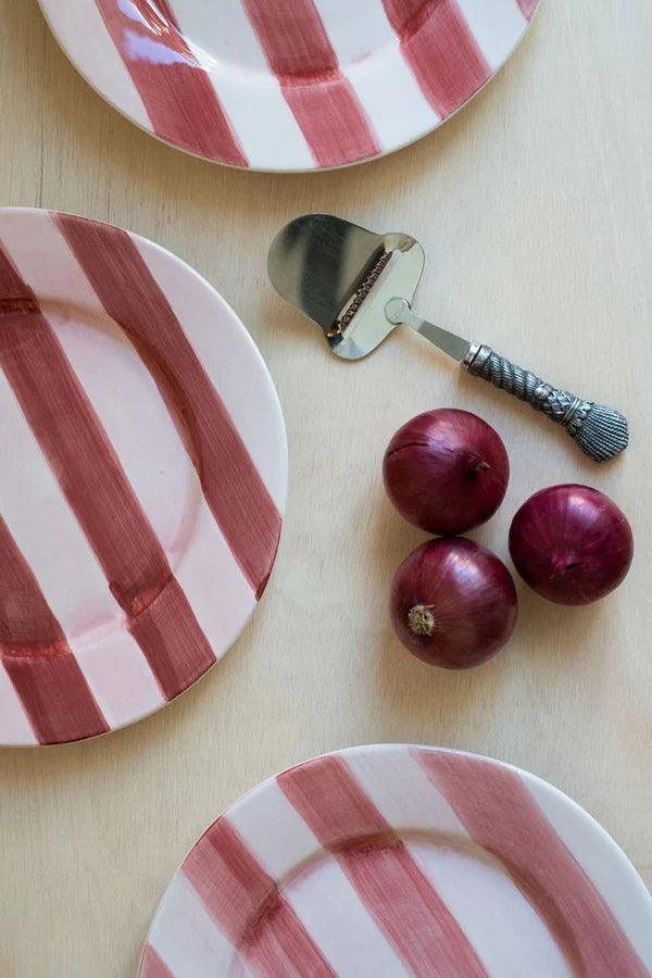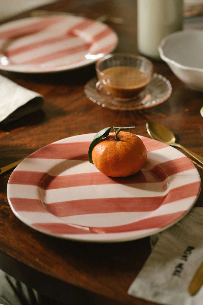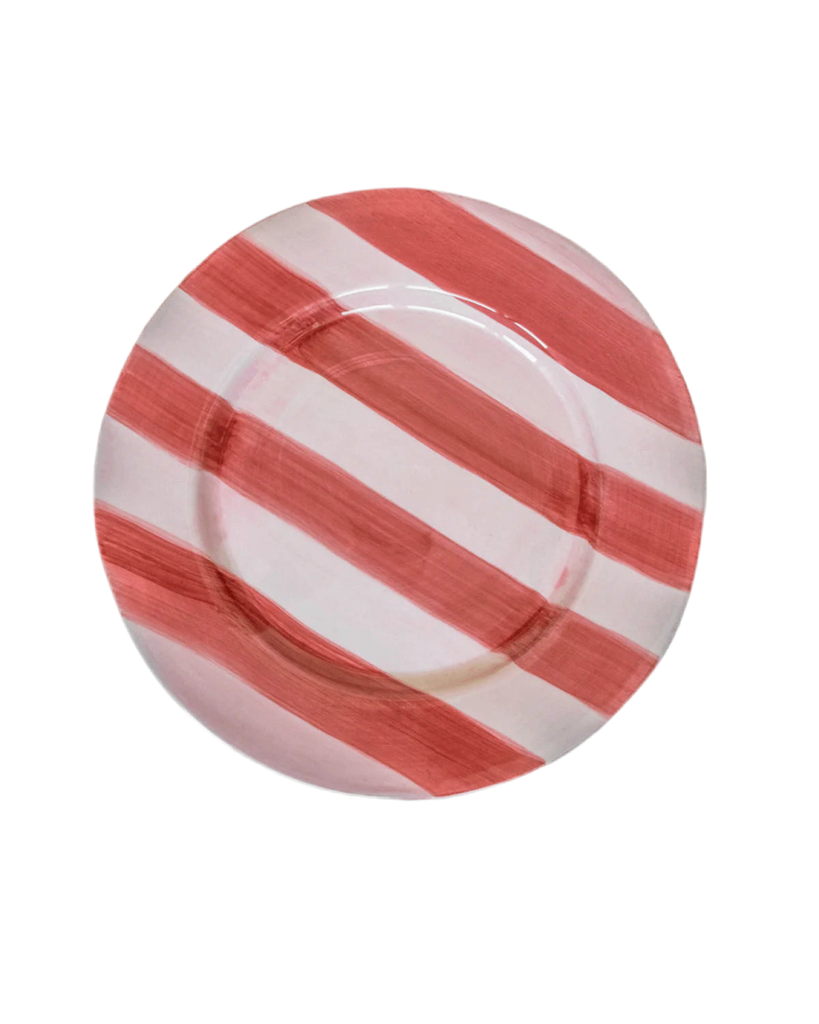 Redefine your table decor with the "Clarice" Hand-Painted Dinner Plate. This striped beauty in green and blue adds an artistic touch to your table setting.