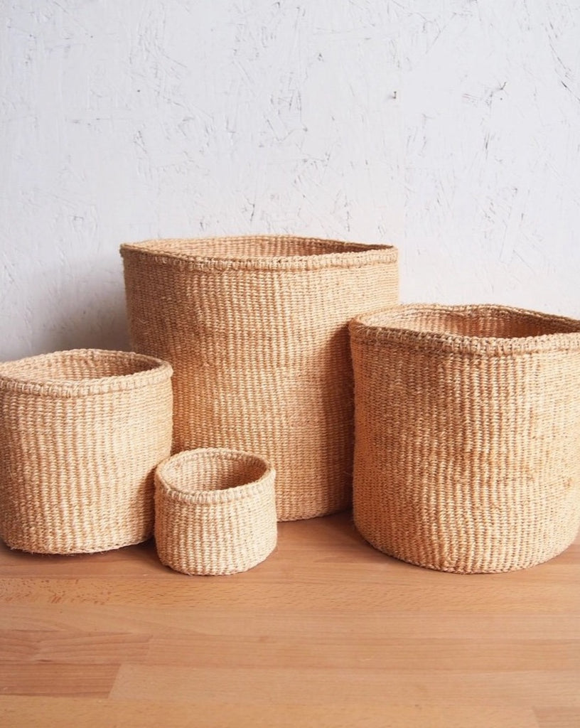 These plant-based sisal woven baskets are handmade by a weaving cooperative in southeastern Kenya. The women hand-dye the sisal fibers and weave them into these beautiful works of art.