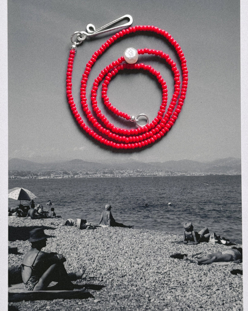 A single freshwater pearl strung with silk and offset by Cerulean blue Japanese seed beads.