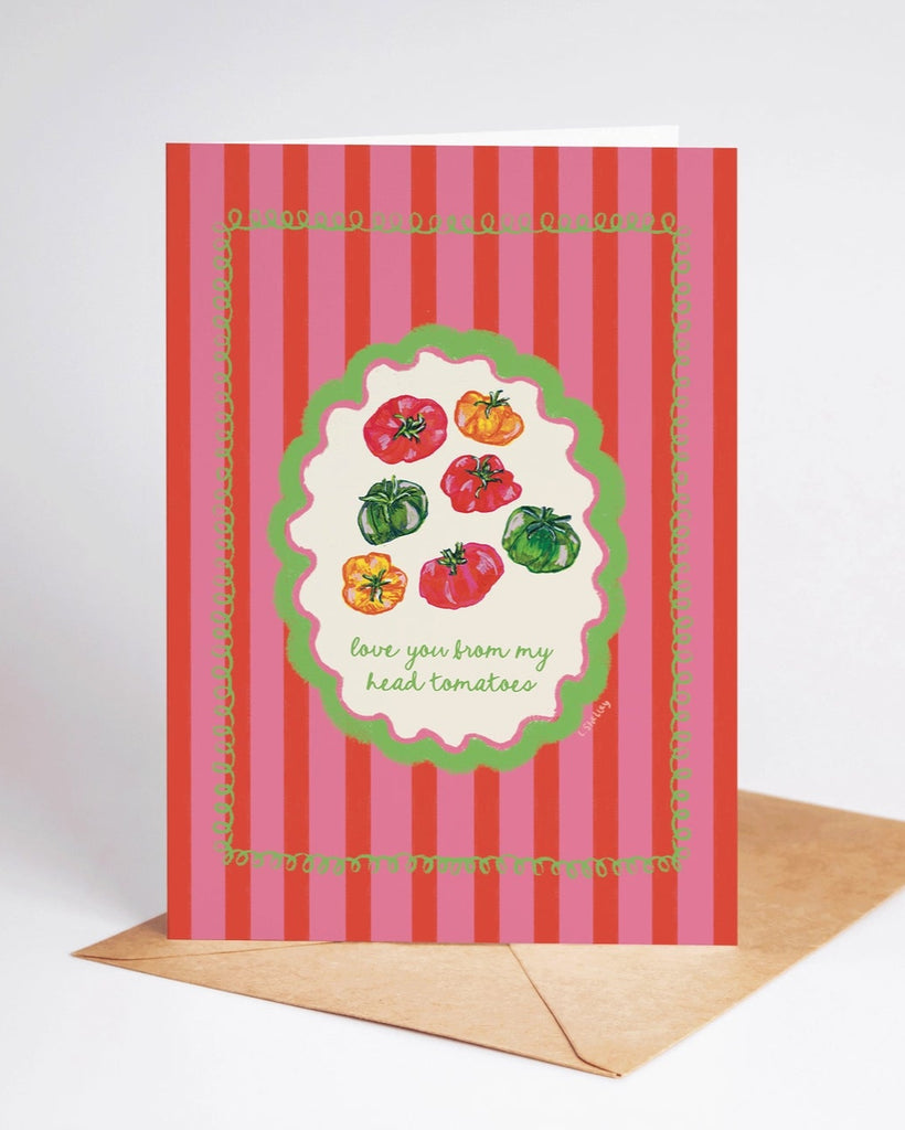 Send some love with this punny 5x7 card, featuring my original gouache artwork of a variety of tomatoes and the phrase "love you from my head tomatoes". The card is blank inside for your own personal message, and comes with a brown kraft envelope.