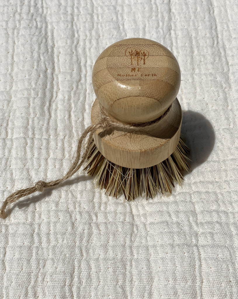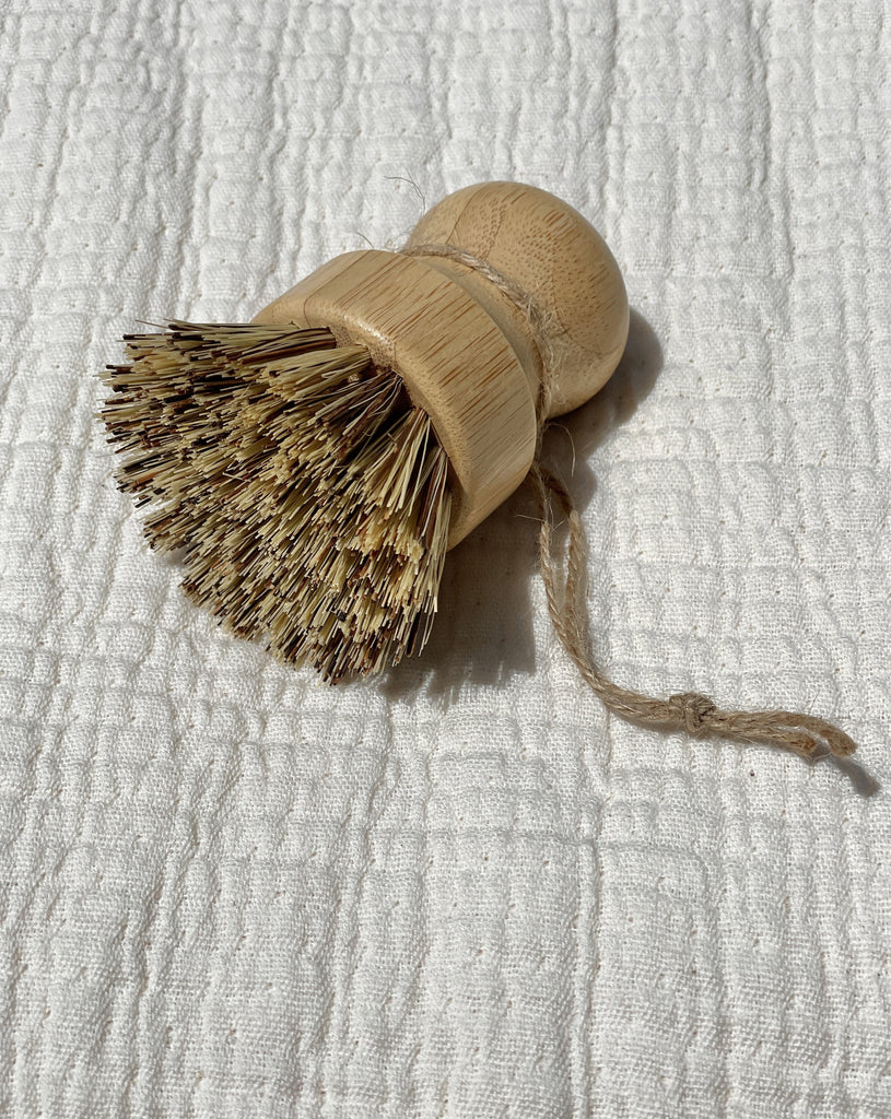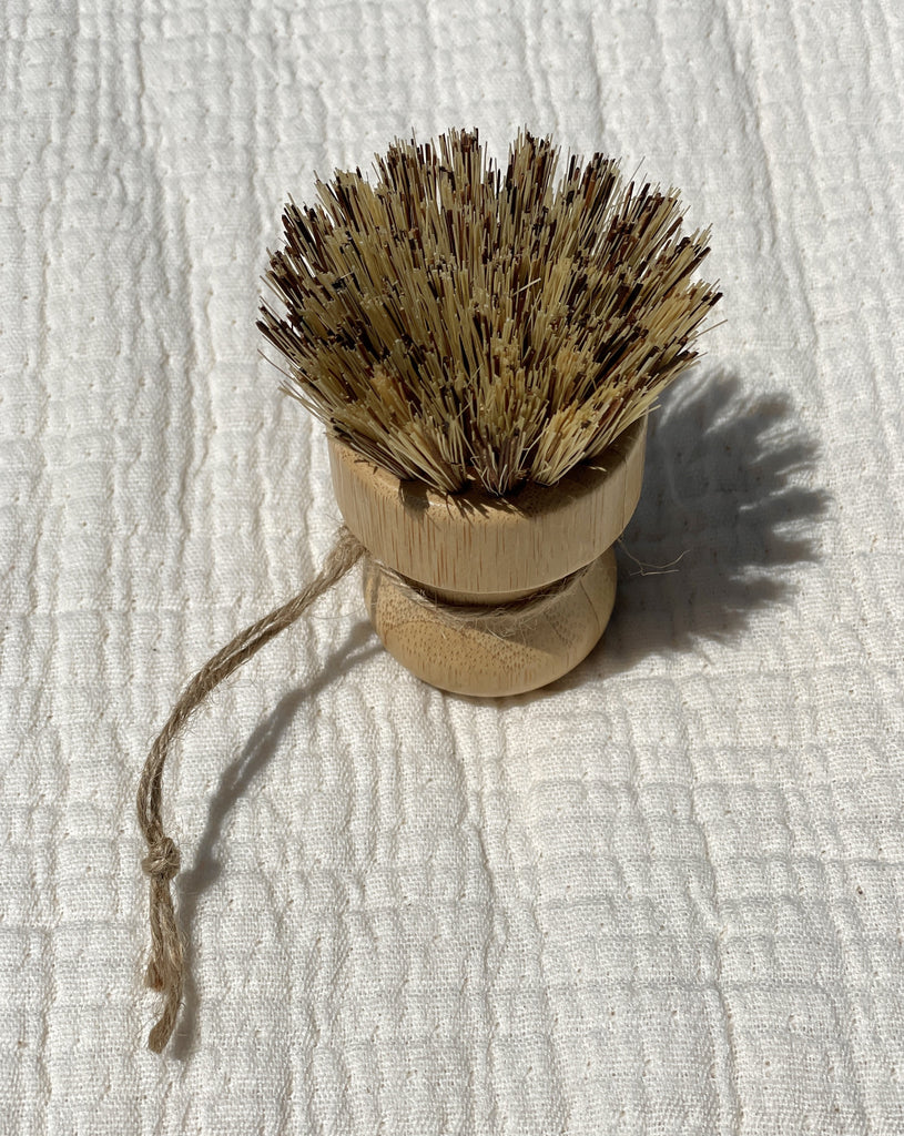 Care: Hang or place on a dry towel to allow bristles to drain in between uses. Wooden handle with stiff palm and sisal (agave plant) bristles. Twine lanyard to hang