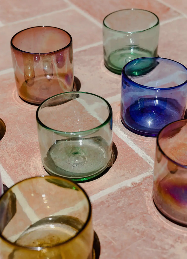 These petite sea glass inspired hand blown tumblers are artisan made in Guadalajara. Their size is perfect for sipping on your favorite spirits. Set includes 2 glasses.