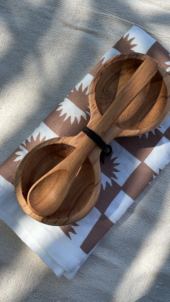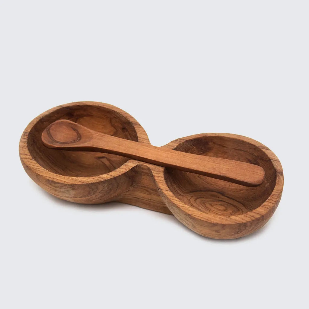 This stylish, sustainably hand carved double bowl is complete with a spoon that nestles into the top. Making a great addition to any modern kitchen, great for dips and entertaining.