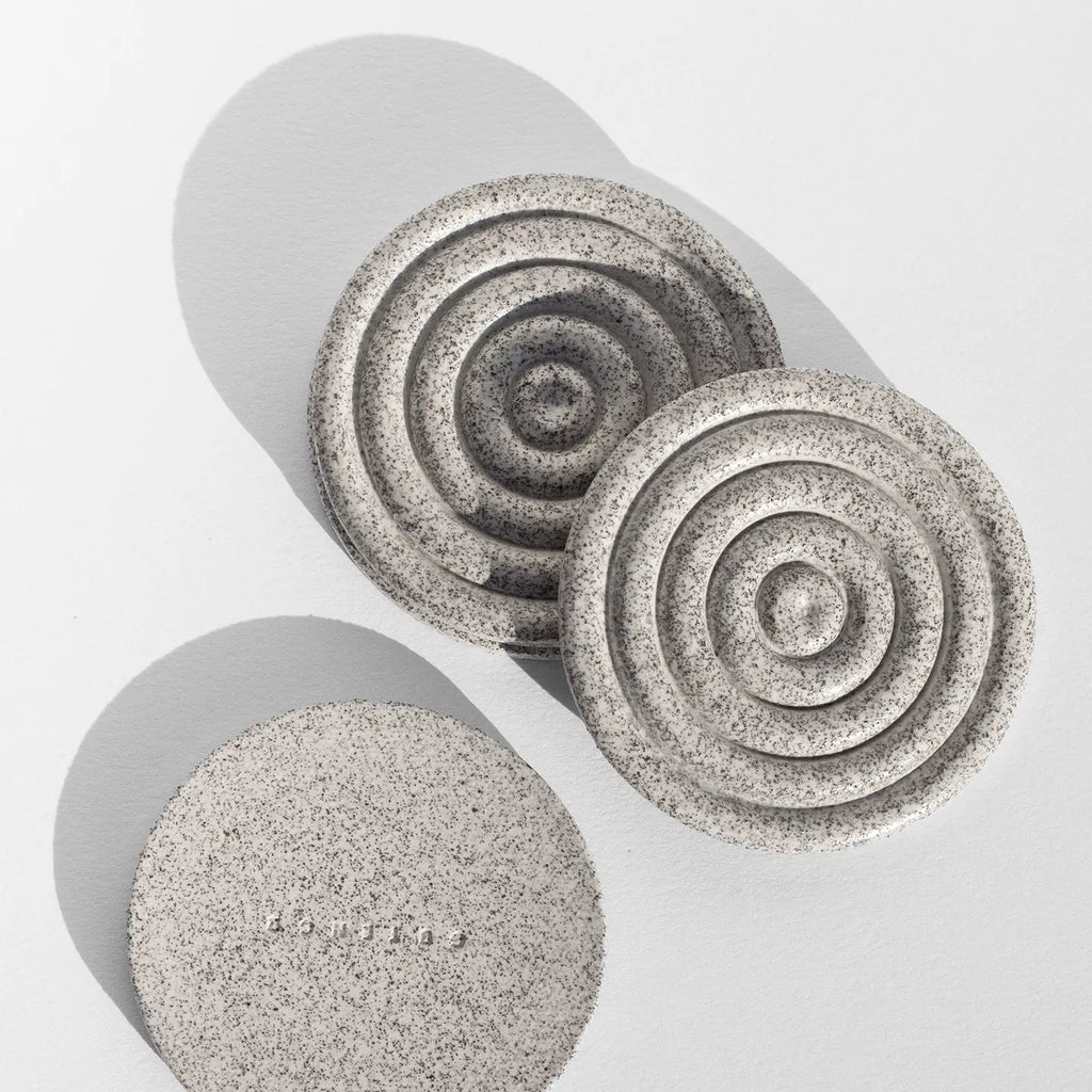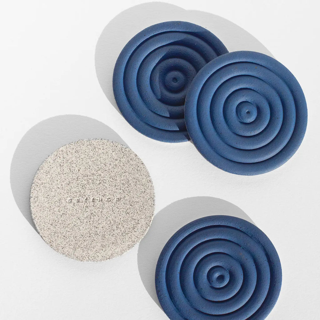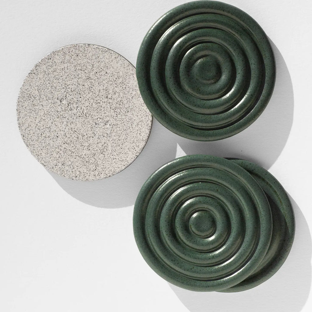 A set of four handmade coasters with a distinctive concentric pattern that catches moisture, protecting the furniture underneath. Made with speckled stoneware clay and glazed in Natural Speckle, Matte Cobalt and Satin Forest.