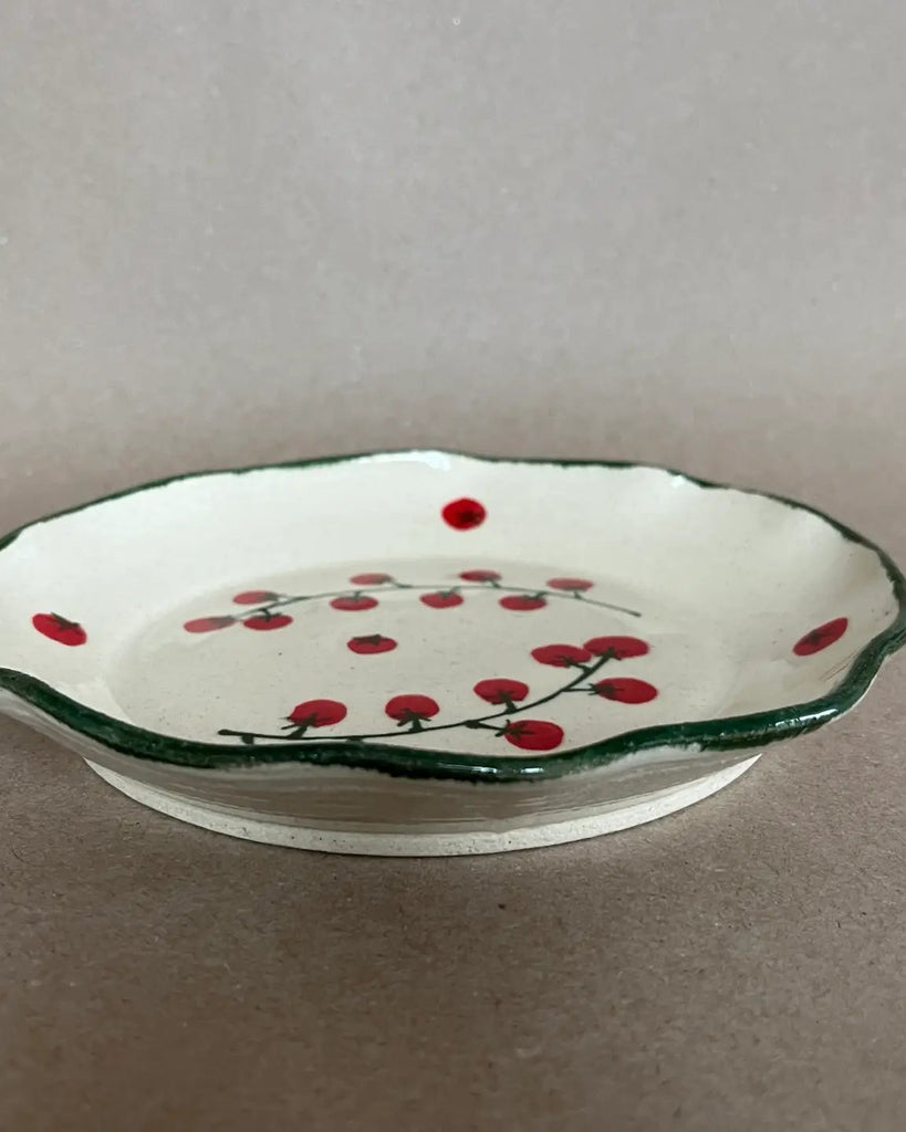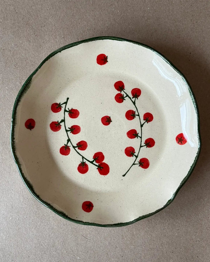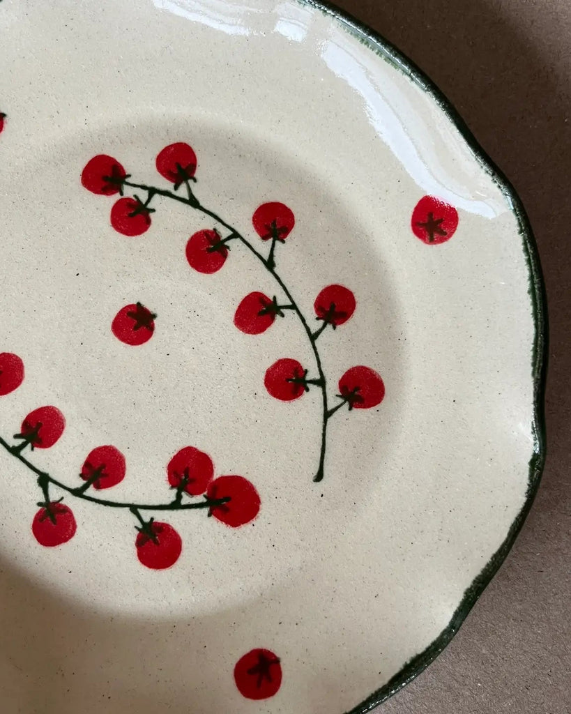 Wheel-thrown and hand-painted cherry tomatoes. The perfect lunch or salad plate for your fresh harvests. Wavy, dark green-painted rim for a handmade, whimsical aesthetic.