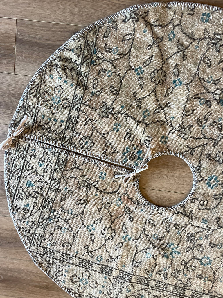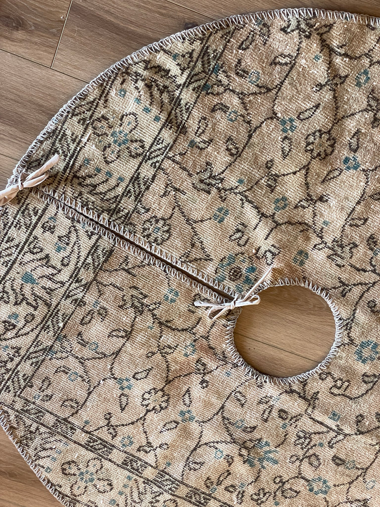 Details: Classic round 4' wide tree skirt with ties to securely fasten in place. Hand-knotted, vegetable, and plant-dyed wool with cotton backing. Age-related wear and patina are considered normal in these unique rugs. Some items may not be perfectly centered since these pieces are handmade. We consider these characteristics as part of what makes them one-of-a-kind.