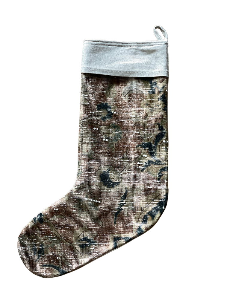 These adorable holiday stockings are made out of salvaged rugs from the 60's and 70's. When a full rug is no longer usable, artisans salvage pieces of the rug and back them with organic cotton to create decorative accents. Each stocking is one of a kind making it truly special!