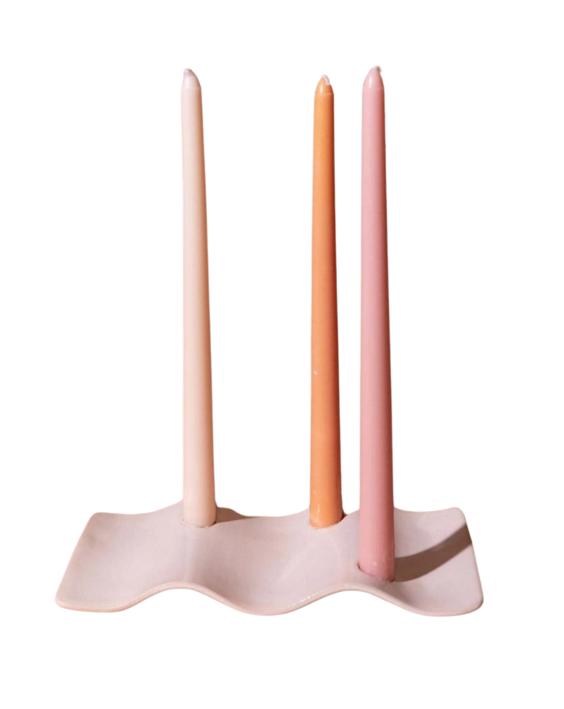 Elevate your tablescape with this wavy candle holder made for tapers. Beautiful peach, pink and gold flecks break over the white base, resulting in the hazy mirage effect. Handmade by Dune Brooklyn