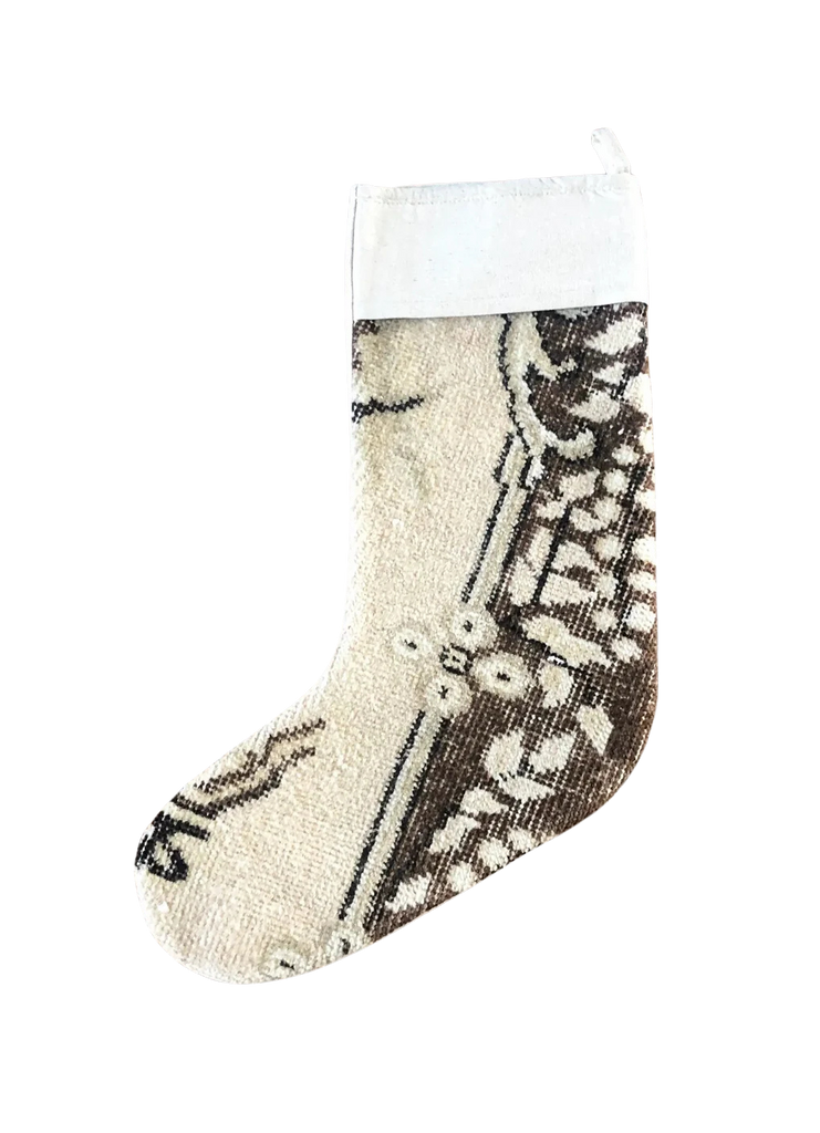 These adorable holiday stockings are made out of salvaged rugs from the 60's and 70's. When a full rug is no longer usable, artisans salvage pieces of the rug and back them with organic cotton to create decorative accents. Each stocking is one of a kind making it truly special!